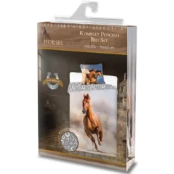 Animal Pictures Dekbedovertrek, Galopperend Paard. Mooi katoenen dekbedovertrek met een paarden-thema. Dit mooie bruine paard komt je tegemoet gerend. Het opstuivende zand lijkt net echt! Een geweldige blikvanger voor een slaapkamer van een paarden liefhebber. De achterzijde van het overtrek heeft een patroon van hoefijzers, leuk om daarom het dekbed een stukje open te slaan bij het opmaken. Of gebruik hem tweezijdig. Samen met het extra grote kussensloop, haal je een geweldig product in huis en is dit een geweldig cadeau om te geven óf te krijgen!