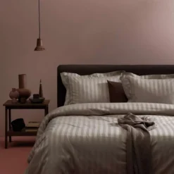 Prachtige effen dekbedovertrekken van Nederlands top fabrikant Damai. Leverbaar in verscheidene kleuren met een subtiel geweven jaquard streep, een weldaad om onder te slapen. Heerlijk zacht satijn gemaakt van het beste katoen. Bij satijn is de katoen met een speciale weeftechniek verwerkt waarbij de garens heel dicht op elkaar geweven worden. Dit maakt de stof heel soepel. Kenmerkend is de glans aan de bovenzijde die meteen ook een luxe uitstraling geeft.