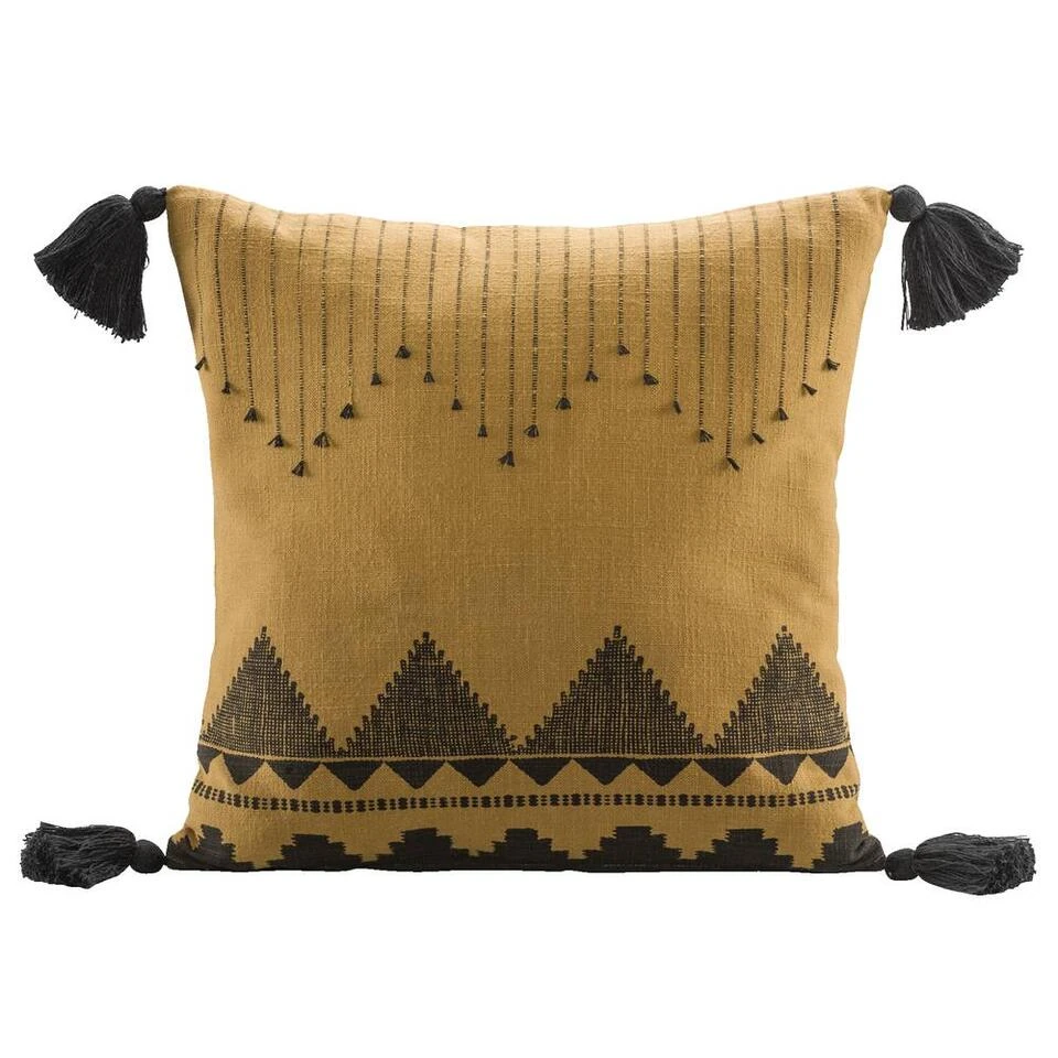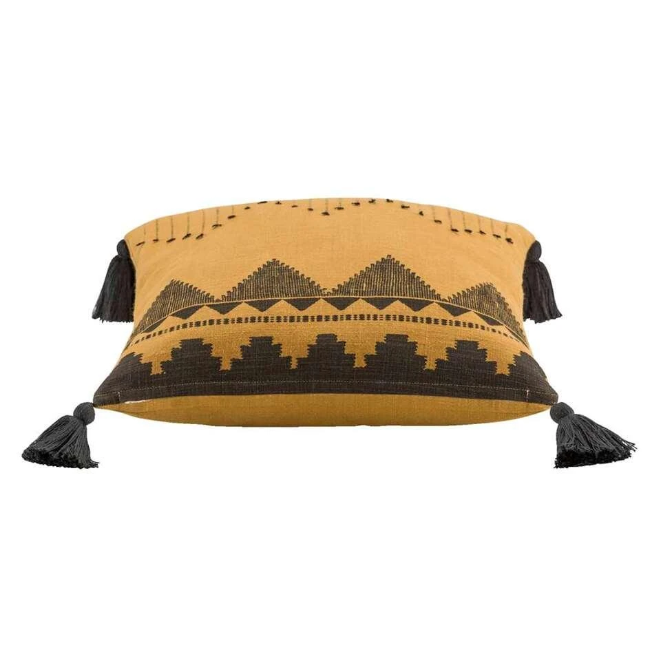 Het kussen heeft een stoere uitstraling met zijn etnische dessin en leuke klosjes.