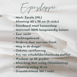 Zavelo kussenslopen van stevig katoen, verkrijgbaar in 9 trendy kleurtjes. De maat 60 x 70 cm is de standaardmaat voor Nederlandse hoofdkussens. De set bestaat uit twee kussenslopen met een effen kleur. Goede kwaliteit 100% katoen en strijkvrij. De kussenslopen zijn vochtabsorberend en warmteregulerend en beschermd je kussen tegen vuil en vocht. Simpel en tijdloos, maar toch ook verfijnd en luxe.